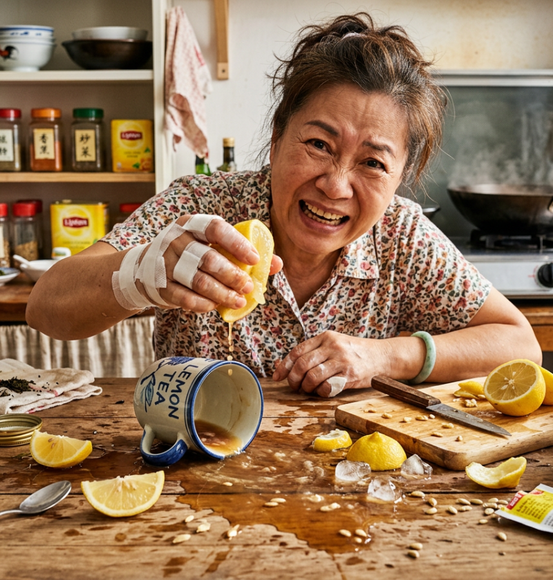 第二下:柠檬皮打碎,释放出大量苦涩的皮油,整杯变苦。