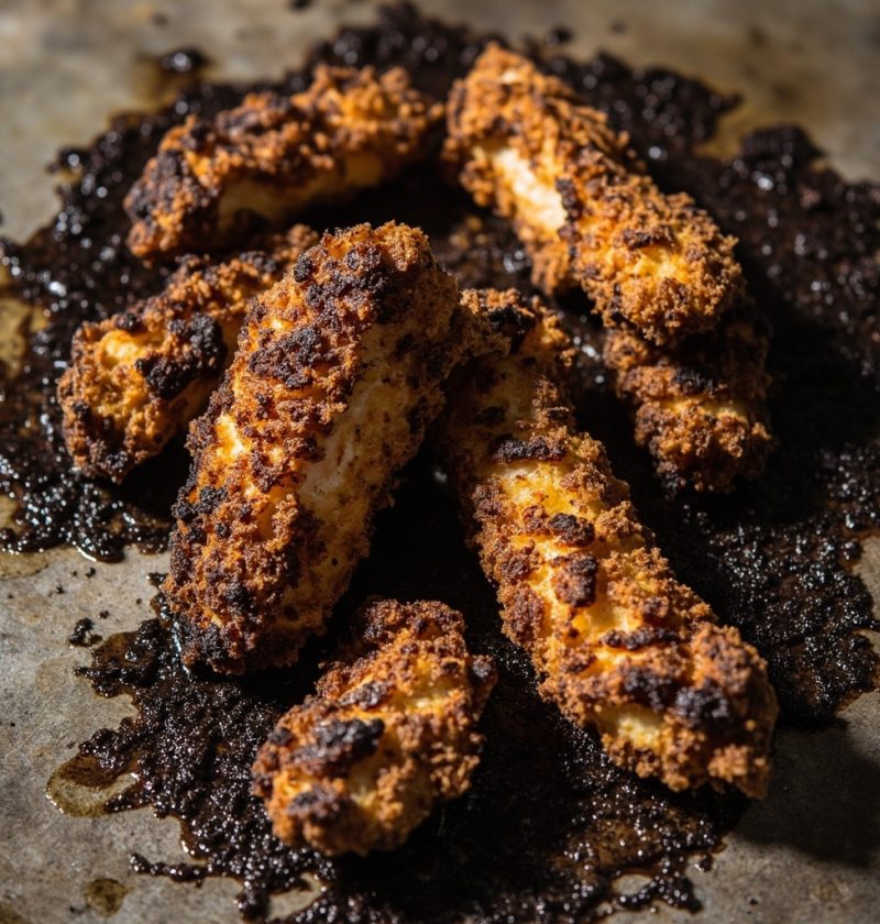 外观方面:面包糠炸成深棕色,有些已经烧焦,鸡肉条裹着一层硬壳