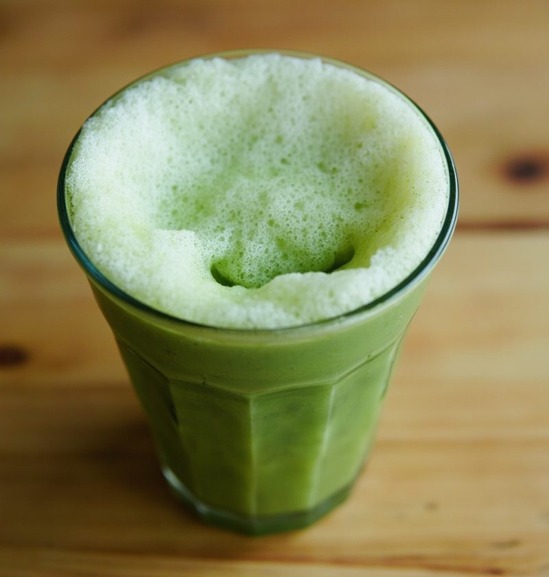 不是分层的”茶+奶盖”,而是完全混合在一起的、淡绿色的、有点浑浊的液体。