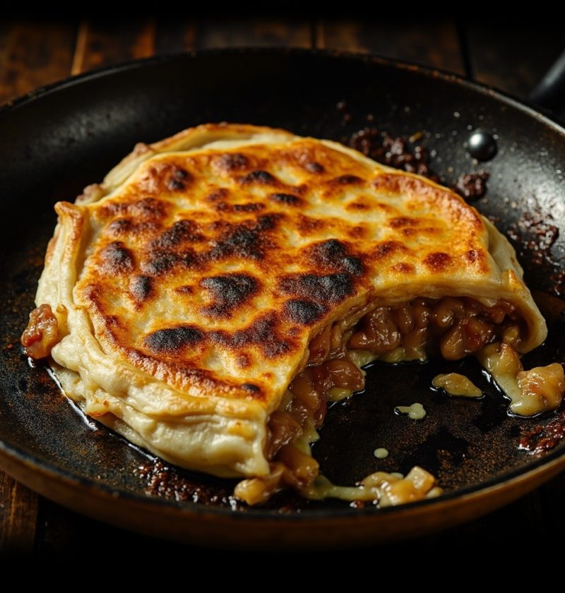 翻面的时候,馅饼底部牢牢粘在锅上,一翻就破了。